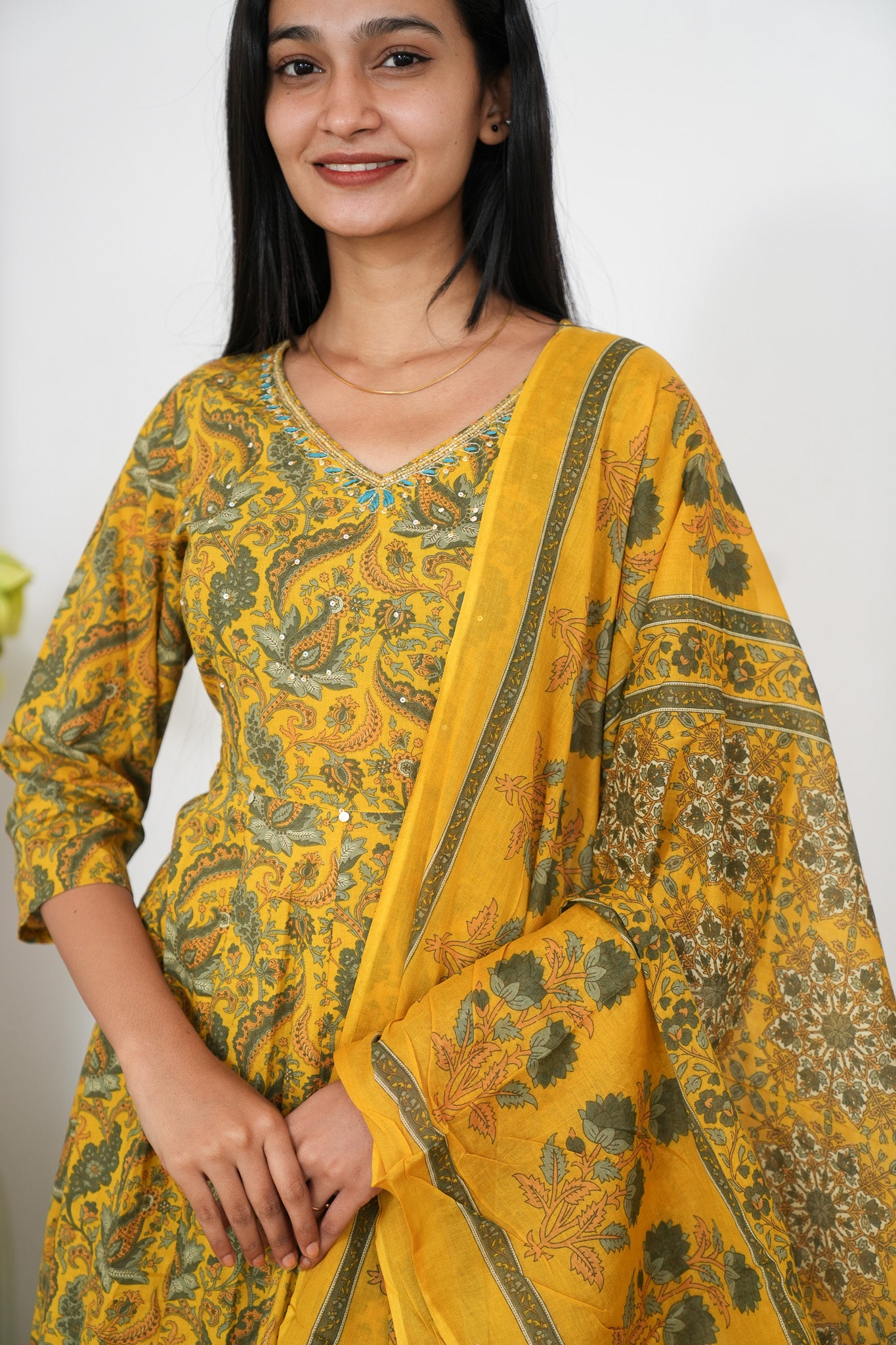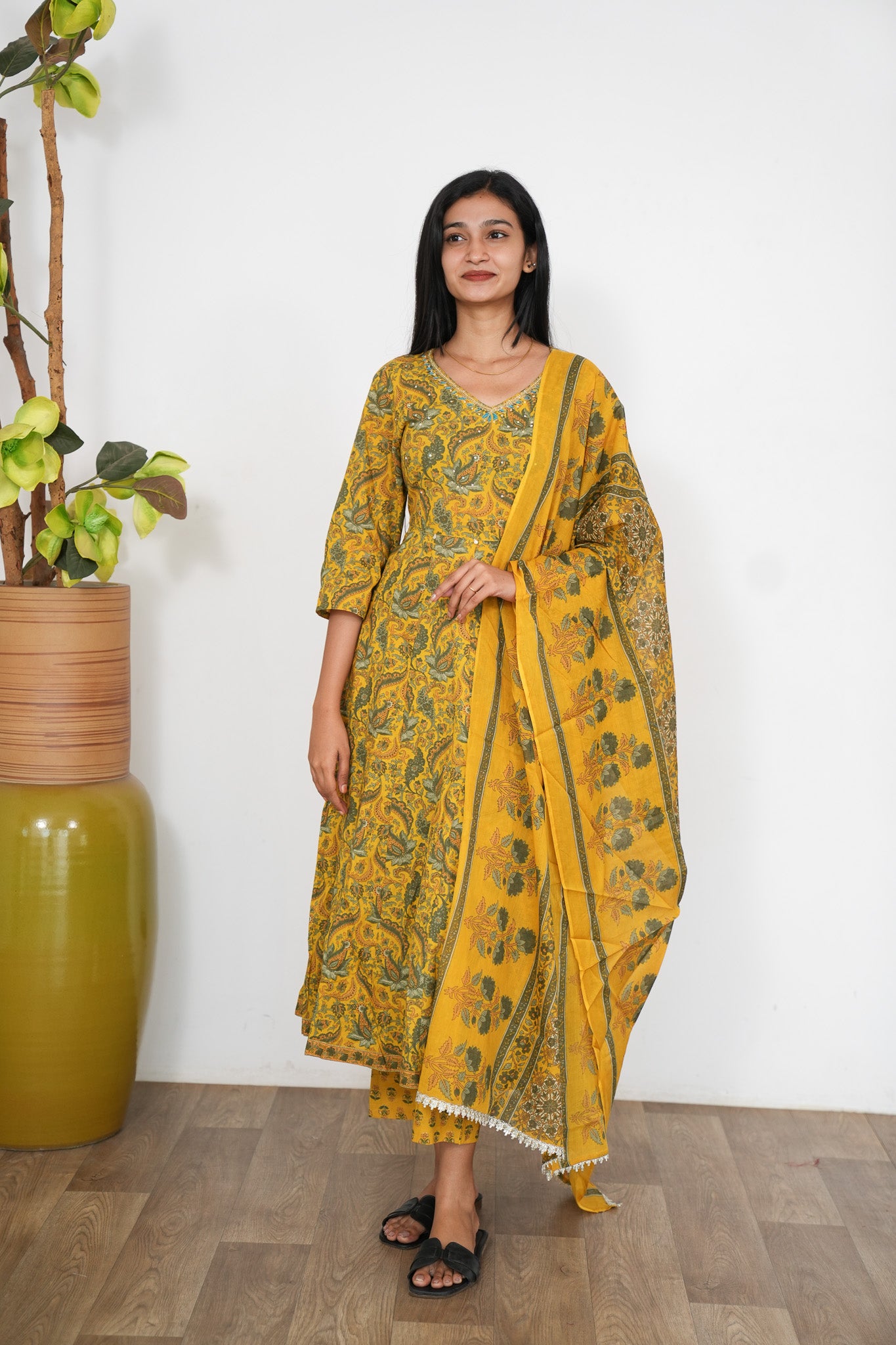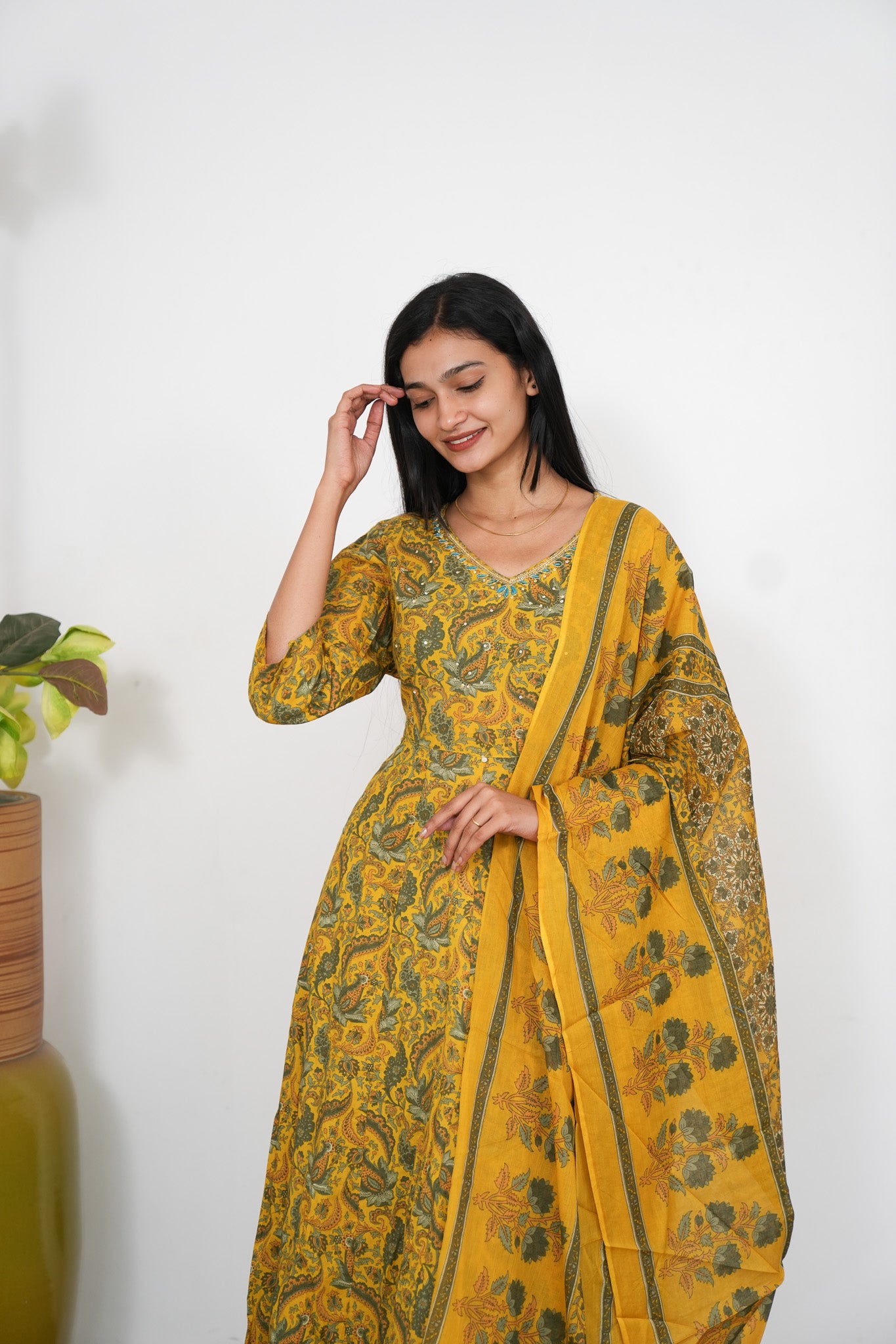 This stunning, vibrant cotton suit set has round neck with floral pattern allover kurta. The pant comes with an elastic and straight cut. It is paired with matching cotton dupatta.