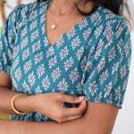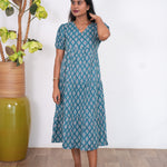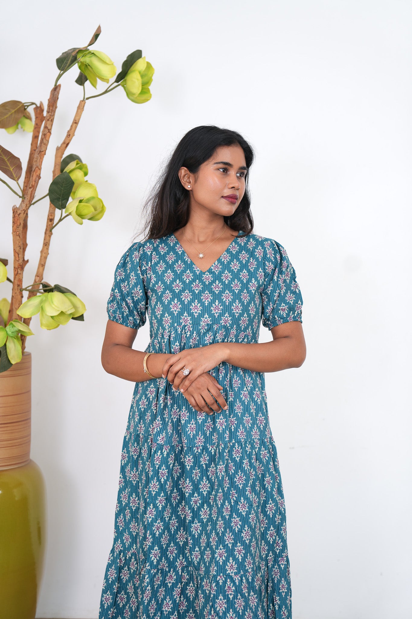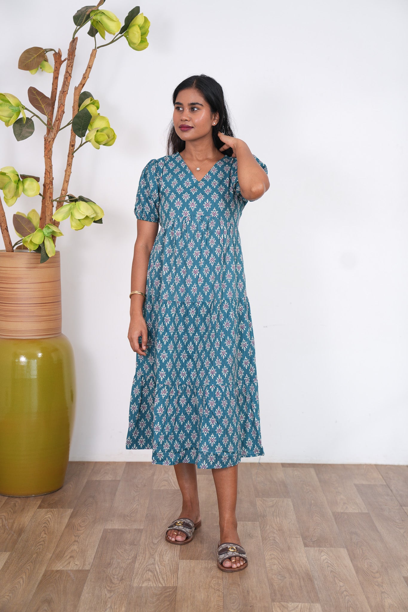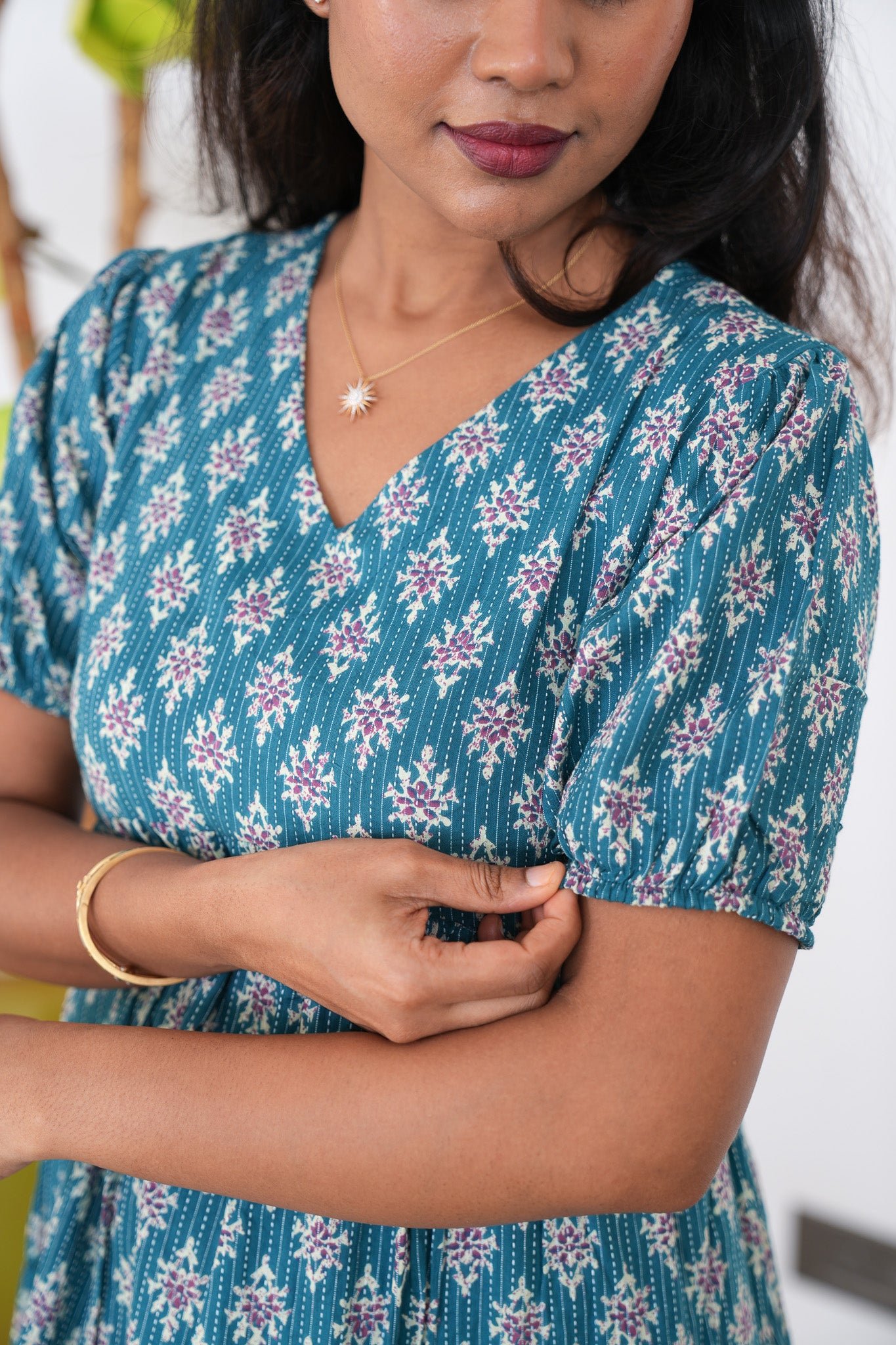 Sea blue katha cotton dress with V neck and balloon sleeves. It has floral print all over the dress.