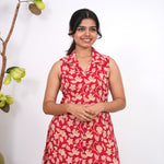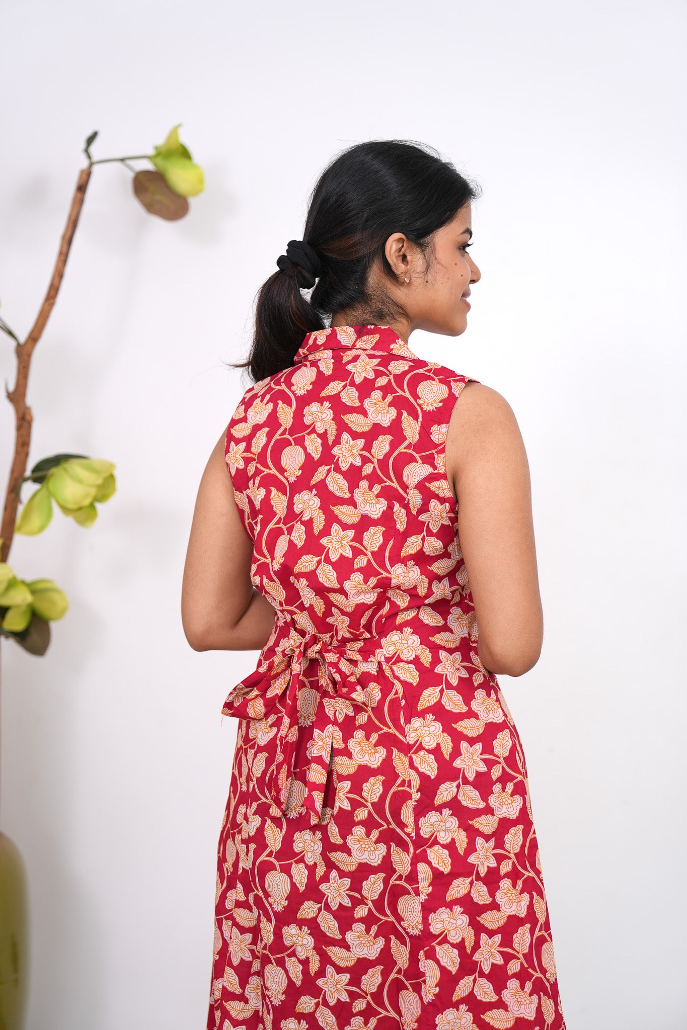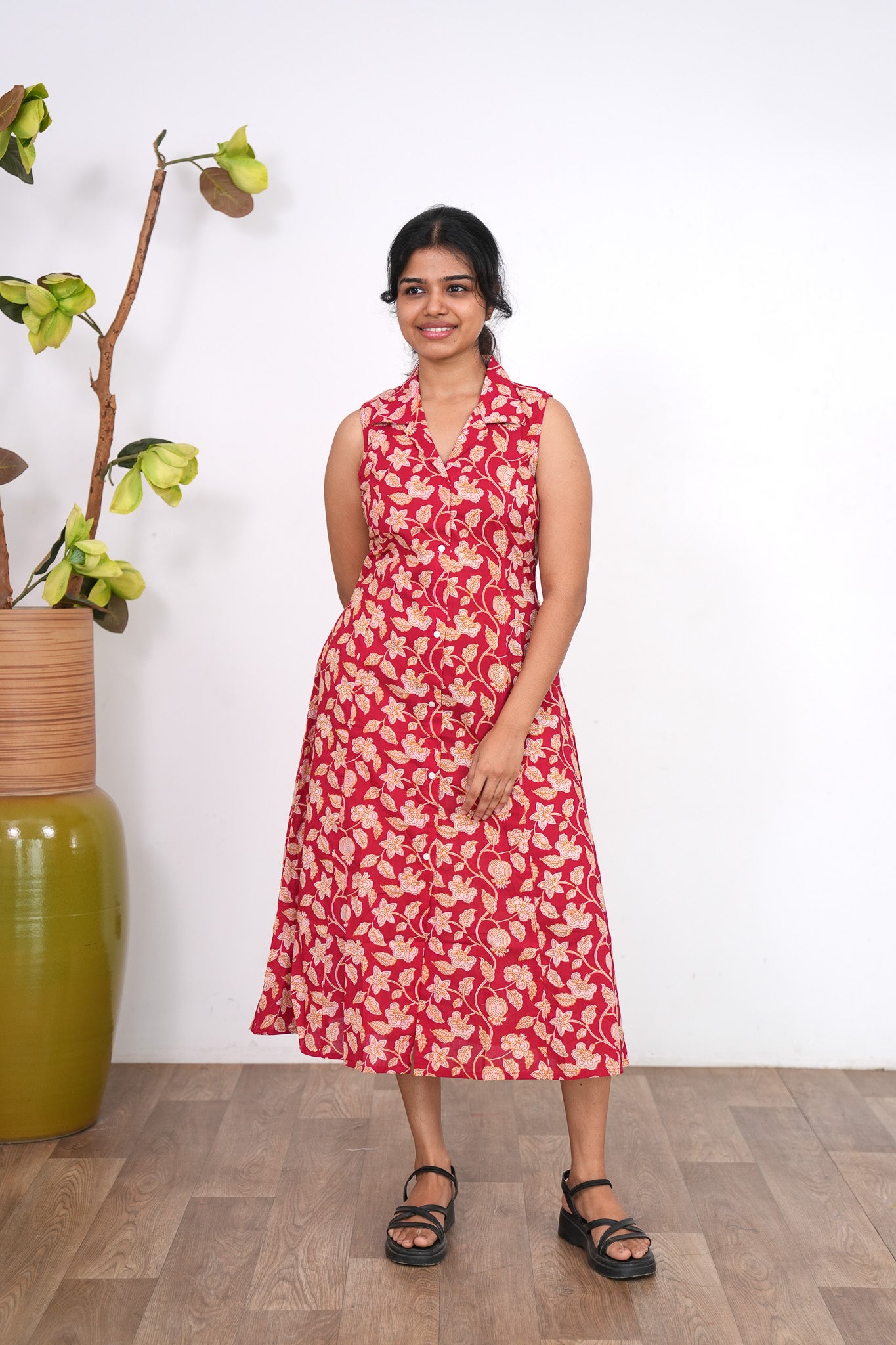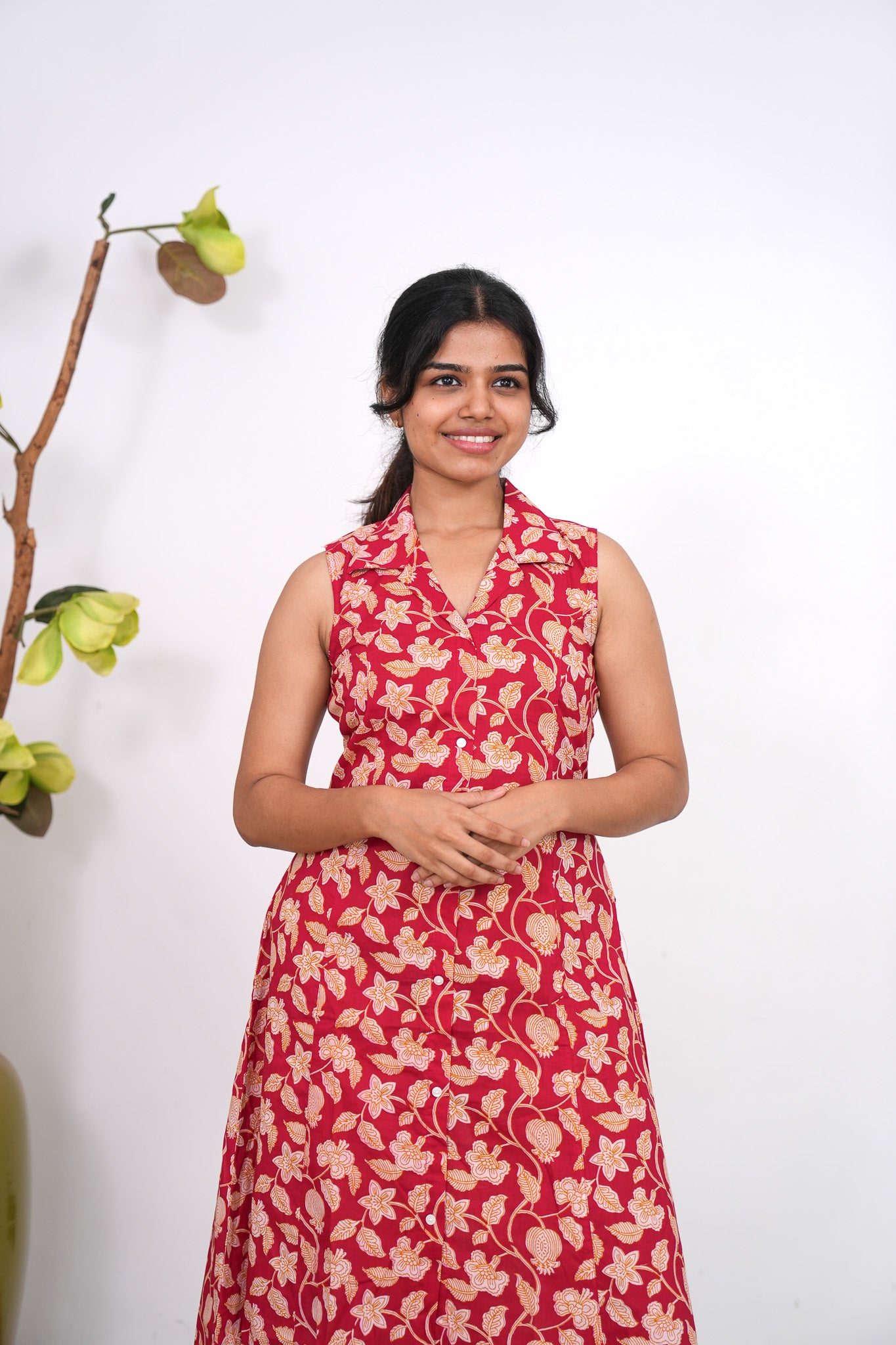 Crimson hibiscus cotton shirt dress(attached sleeves)