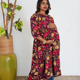 Violet floral maternity nursing wear with round neck and 3/4 sleeves that accomodates the bump throughout nine months and has invisible zip on both sides to carefully feed baby. It is light weight and soft to help you get through pregnancy and breastfeeding journey with ease. No pants included.