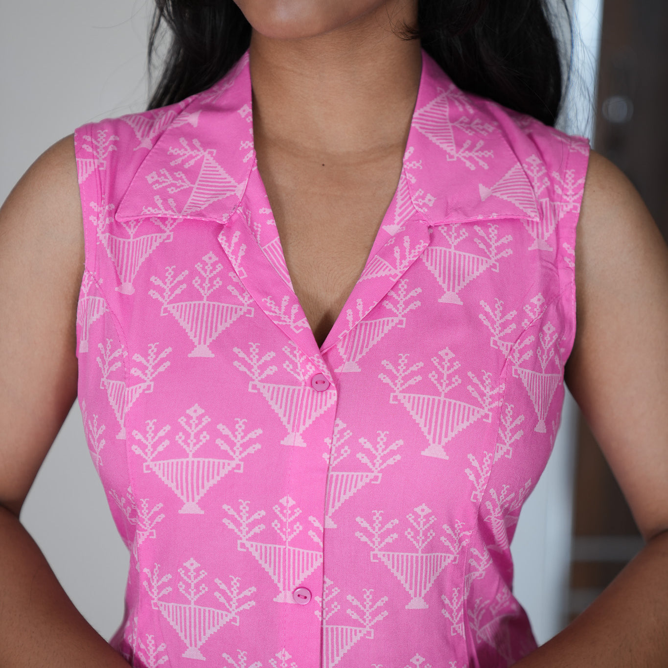 Pink cotton shirt dress that exudes elegance and sophistication. It has buttons running down.
