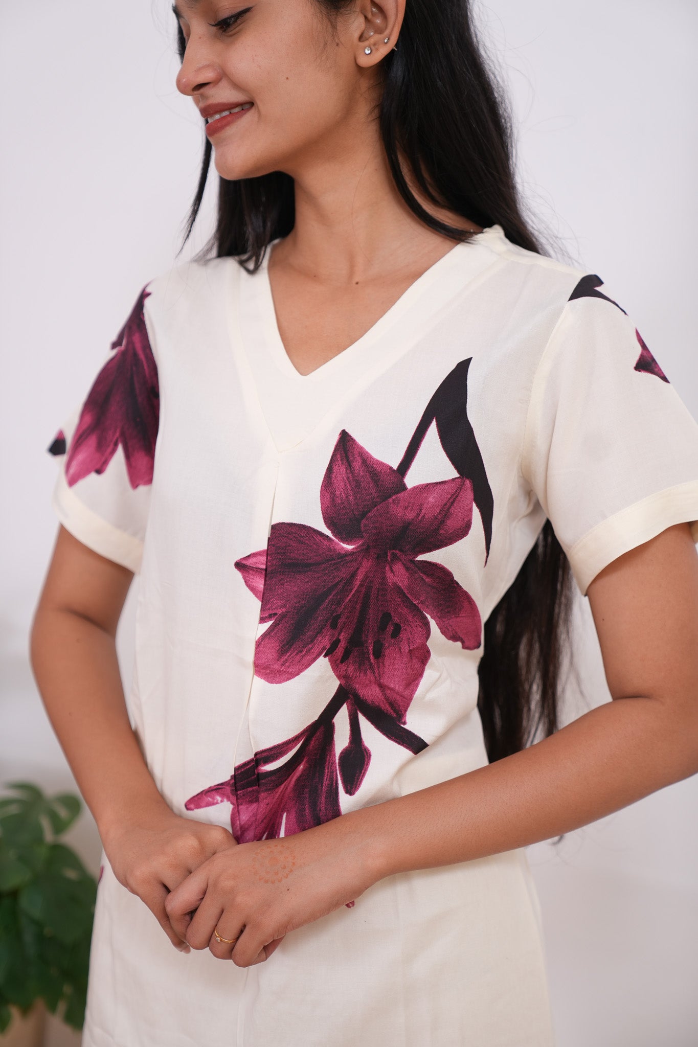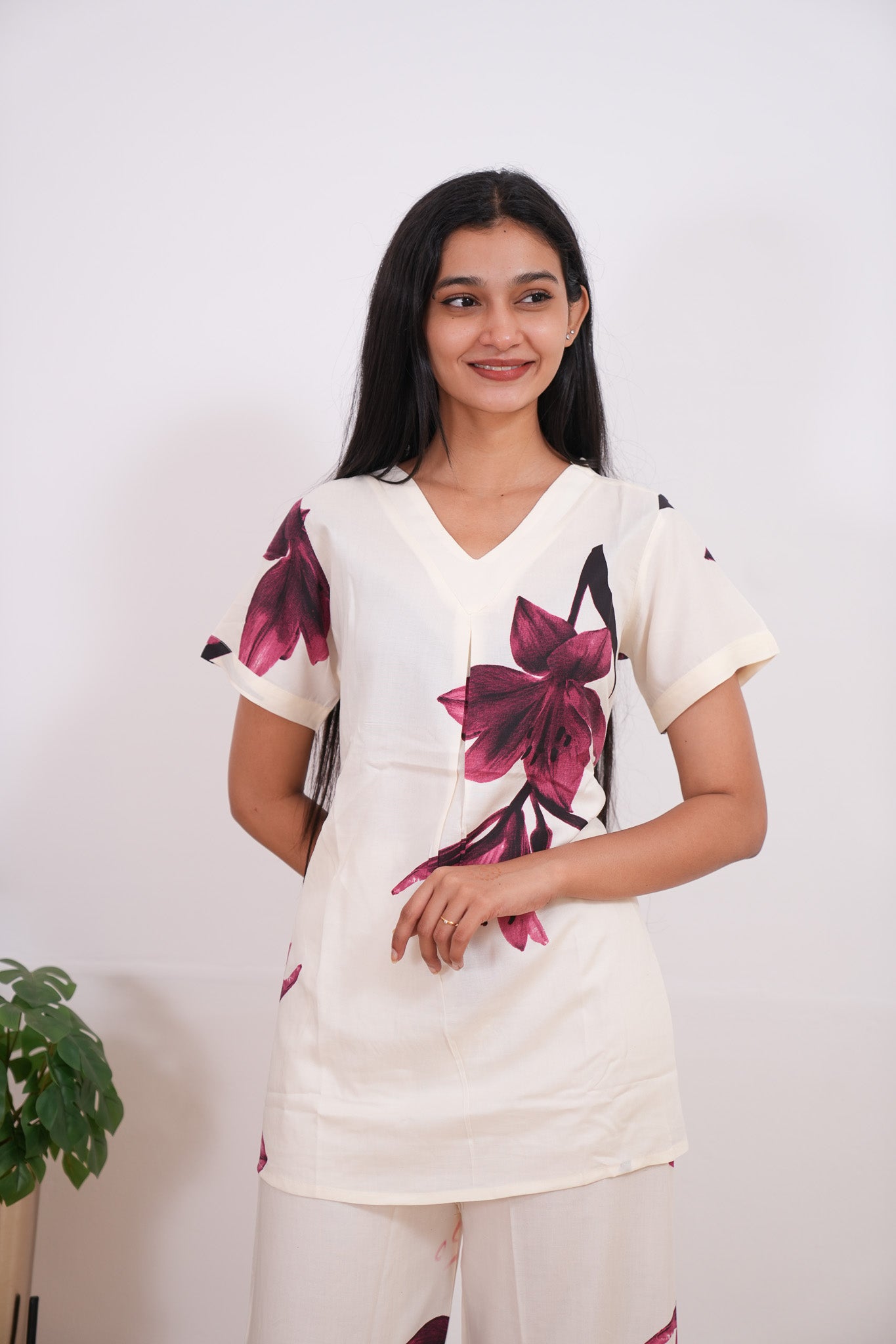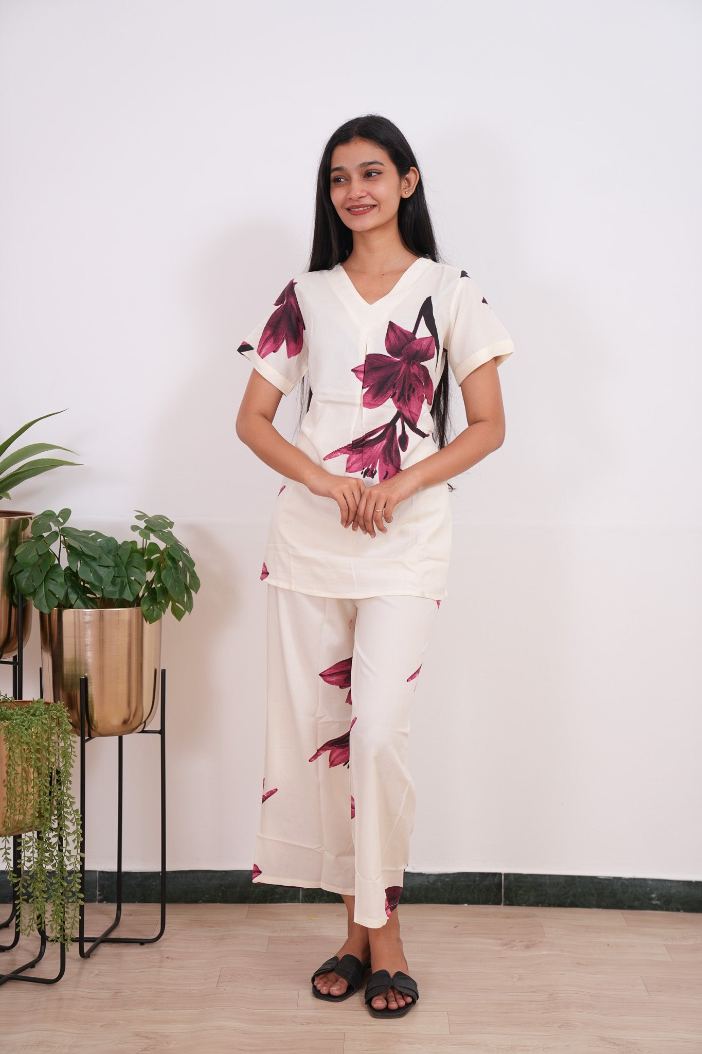 These Co-ords are so cozy, comfortable and chic making it perfect to relax at home or sleep in them. The top has a V neck with short length sleeves. Pant comes with elastic and it has a straight fit.