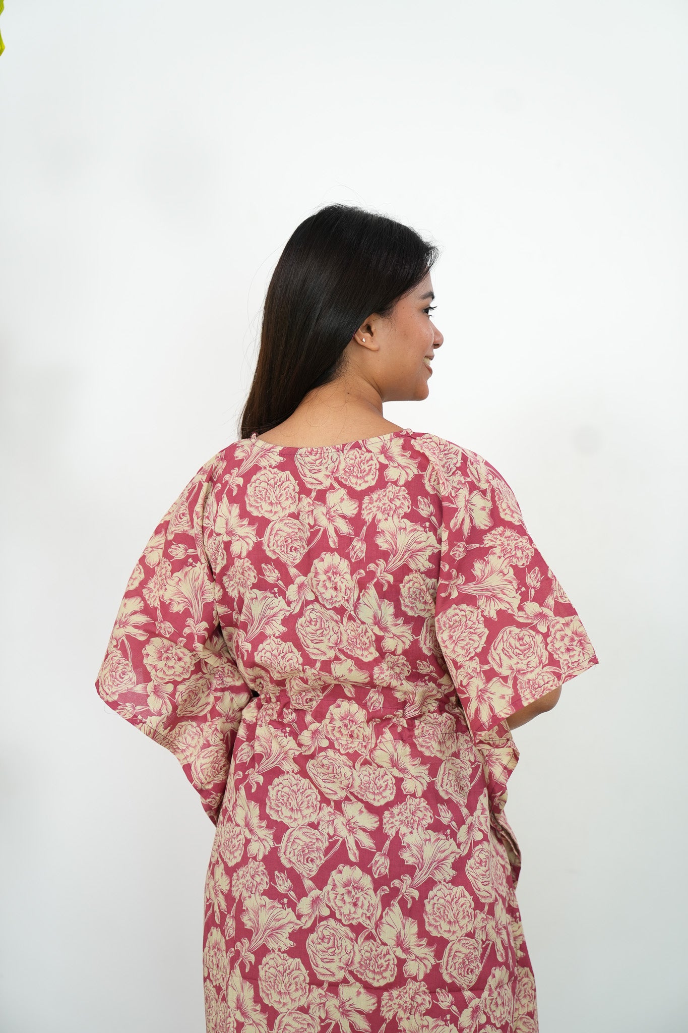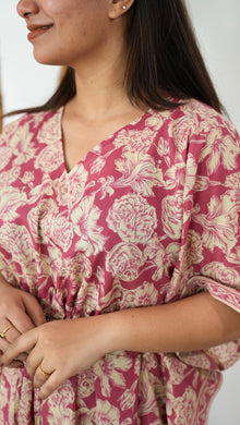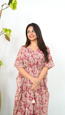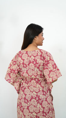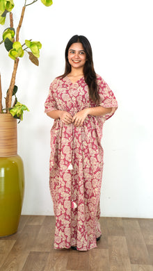 Easy breezy cotton kaftan made for you to feel absolute comfort, elegance and a total stunner at the same time. It comes V neck and tie in the centre with flowy silhouette and floral prints all over.