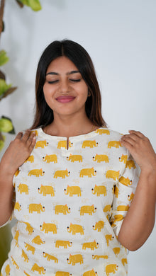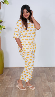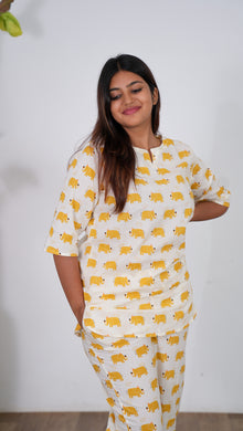 These Co-ords are so cozy, comfortable and chic making it perfect to relax at home or sleep in them. The top has a round neck with elbow length sleeves. Pant comes with elastic and has pockets.