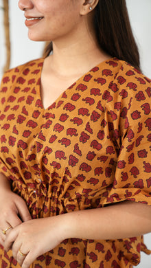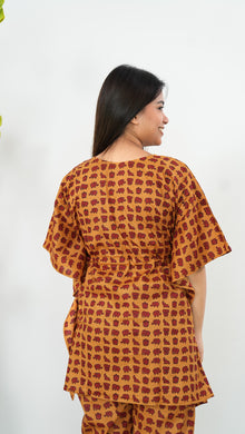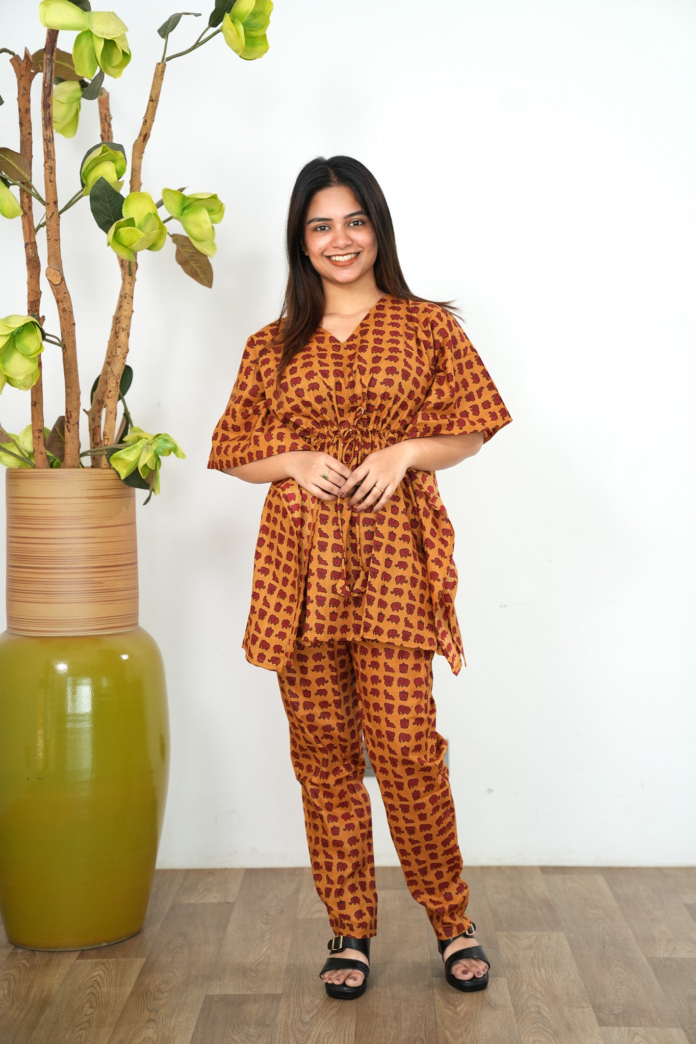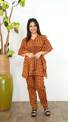 The kaftan top has a centre tie which can be tied to cinch the waist. It is paired with matching straight pants . It comes with half elastic and with front tie in the pants.